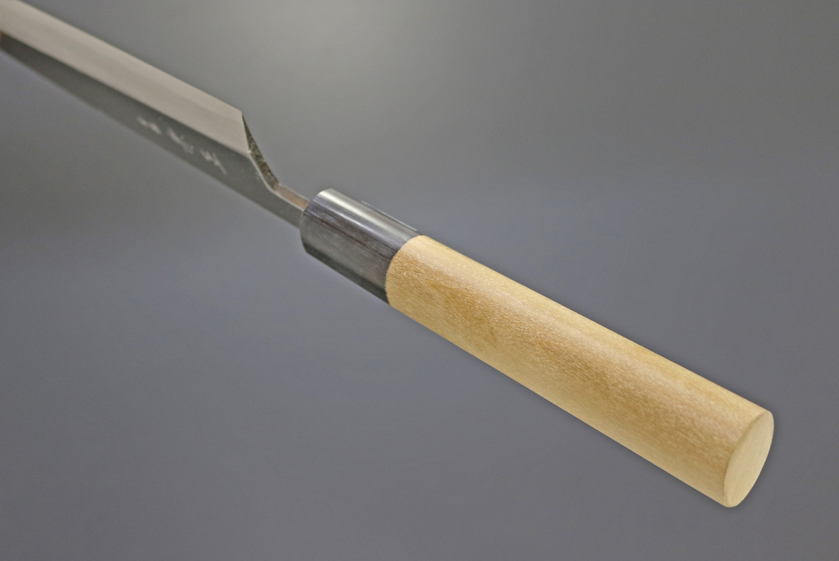 The Honsho Kanemasa G series contains high grade Japanese-style kitchen knives for professional use. Its cutting edge core is made of Hitachi white steel #3, formed during forging with a soft iron for high cutting performance and longer edge retention (Ai-Deba: Yellow steel #3/Soft Iron). The traditional D-shaped Magnolia wooden handle features a water buffalo horn bolster.