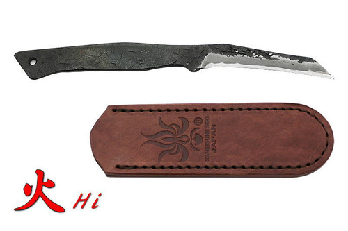 The Kanetsune KB-422 Hi Field Knife features a one-piece white steel #2 blade which is extremely sharp and has a rough hammered black finish. It was designed intentionally so that the handle can be used as it is, or a handle of choice may be added. It all depends upon the unique way in which the craftsman or outdoorsman wishes to use the Hi, and everyone has their own way of using it. Comes with a leather sheath that bears the Kanetsune logo.