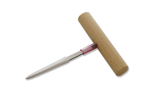 The KC-094 is a unique T-type oyster knife for your prep drawer. The stainless steel blade has a durable wooden handle which will stand up powerfully to repeated use. The blade measures 130mm (5.11") long. The entire piece has been designed to give leverage in openiing those stubborn bivalves. Made in Seki, Japan.