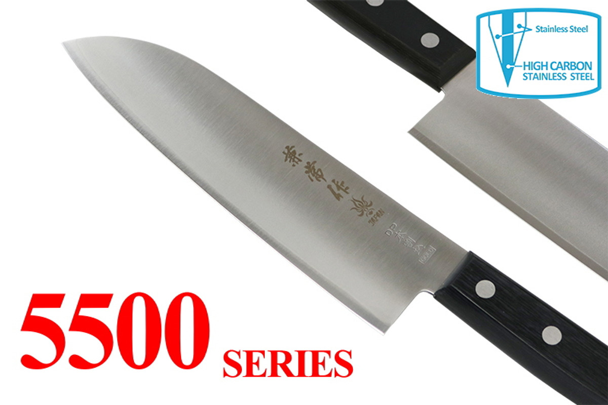 Knives of the 800-Series are a little smaller than the regular Santoku and Nakiri. The simple handles are O-shaped, without a bolster. These are quite sought-after. The Hon-Warikomi-clad blades are made of Takefu Shiro-2 high carbon steel cuttigng core which is sandwiched between SUS410 stainless steel. This provides excellent edge-retention to a hardness of HRC 59 or more.