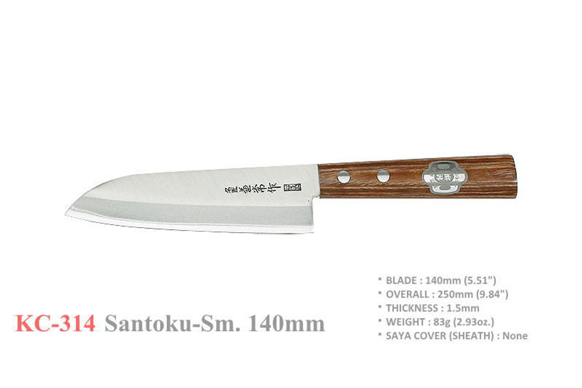 The KC-314 Santoku-Sm features a Takefu Shiro-2 High carbon steel core / SUS410 Stainless steel blade with wood handle. Santoku are all-purpose Japanese knives, and are used in much the same way as a French chef knife.