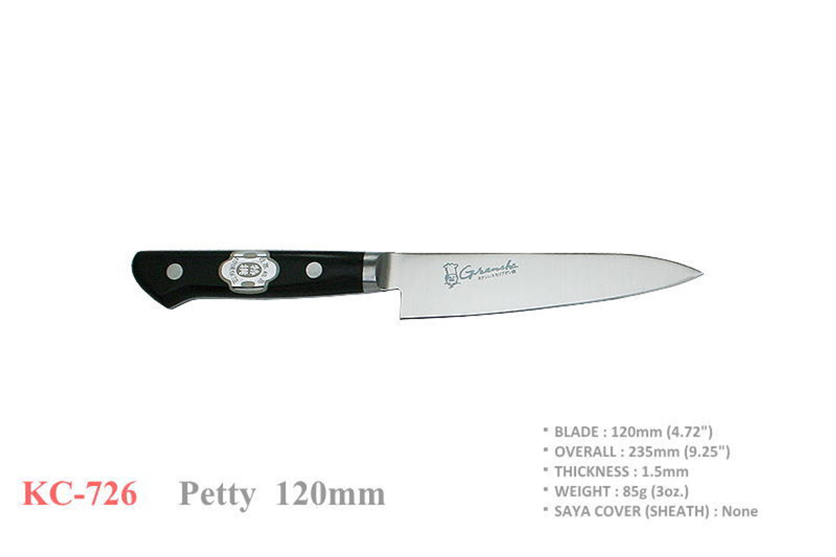 The KC-726 is a petty knife which features a AUS-8 stainless steel blade and a wood handle that has a welded stainless steel bolster. It belongs to the Kanetsune Granshe SX series. The petty knife is a Japanese-style paring/utility knife. It is the perfect tool in the hand for peeling and preparing fruits and vegetables, as well as beautifying dishes with elegant cuts and garnishes. It can also be used as a petite chef knife, which is ideal for smaller hands.