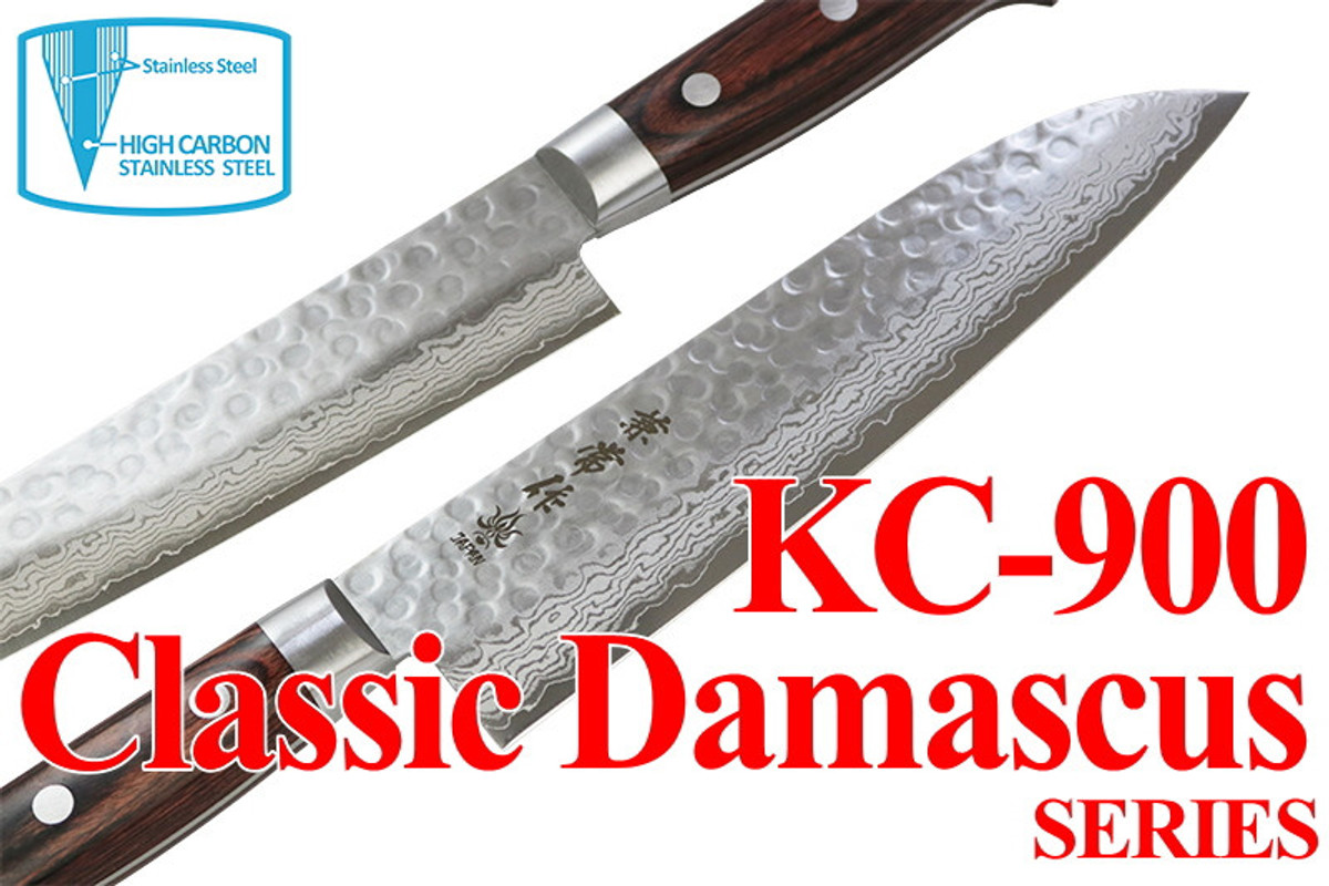 Knives of the KC-900 series feature beautifully hammered "Tsuchime"-finish, Damascus-clad blades made of VG-10 cutting core w/17 layers stainless steel, which provides excellent edge retention to a hardness of HRC 59 - 60. "Tsuchime", is a Japanese-style hammer finish and helps to release foods quickly from the blade while cutting, making the meal-prep process quicker and more efficient. Full-tang construction, with welded bolster, delivers a professional experience. Proudly made in Seki city, Japan.